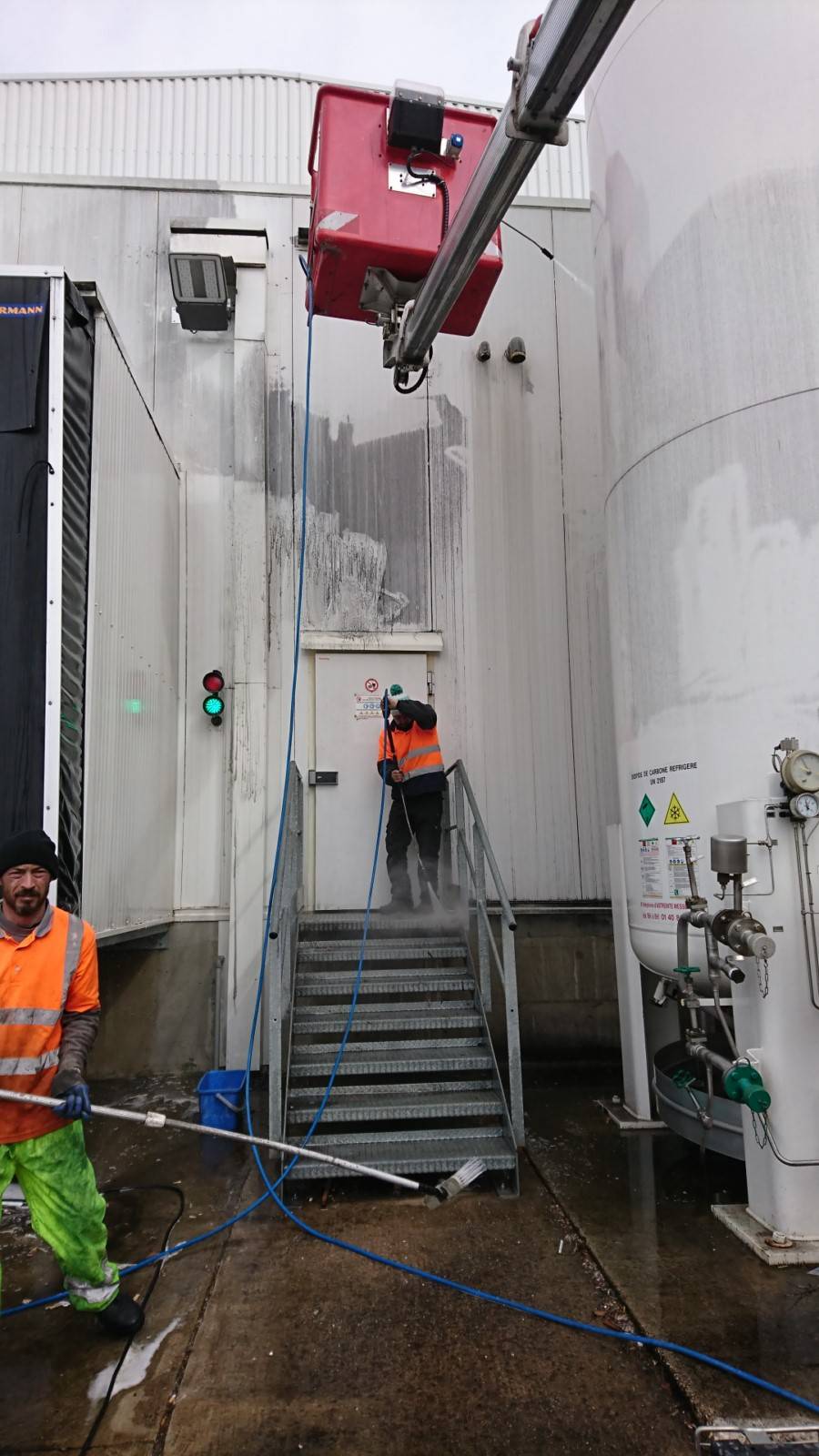 L'objectif était de redonner un coup de propreté a la cuve et aux parois alentour des bâtiments réfrigères du client. Le résultat étant bluffant on s'en rend bien compte sur les photos, le tout réalisé à 15 mètres de haut sur un bras élévateur.
