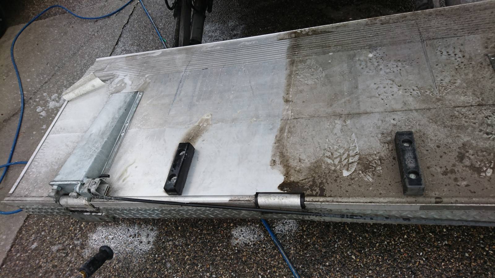 Nous vous présentons dans cette rubrique la partie rénovation du hayon, avec les étapes de réalisations. Pour commencer nous réalisons un passage d'eau à haute pression pour enlever le plus gros comme les saletés et les taches grasses. Ensuite nous avons appliqué un premier dégraissant par vaporisateur, puis une solution de rénovation de l'aluminium, le hayon a ainsi retrouvé une belle brillance !